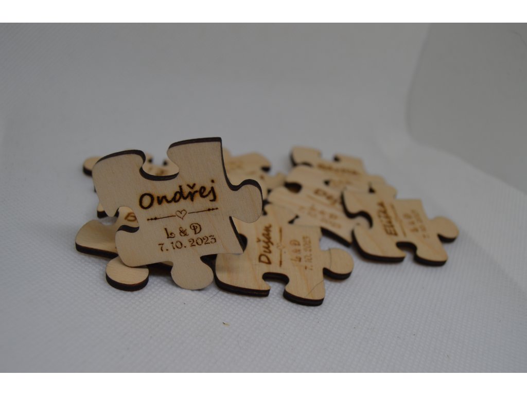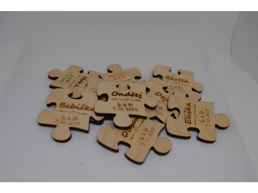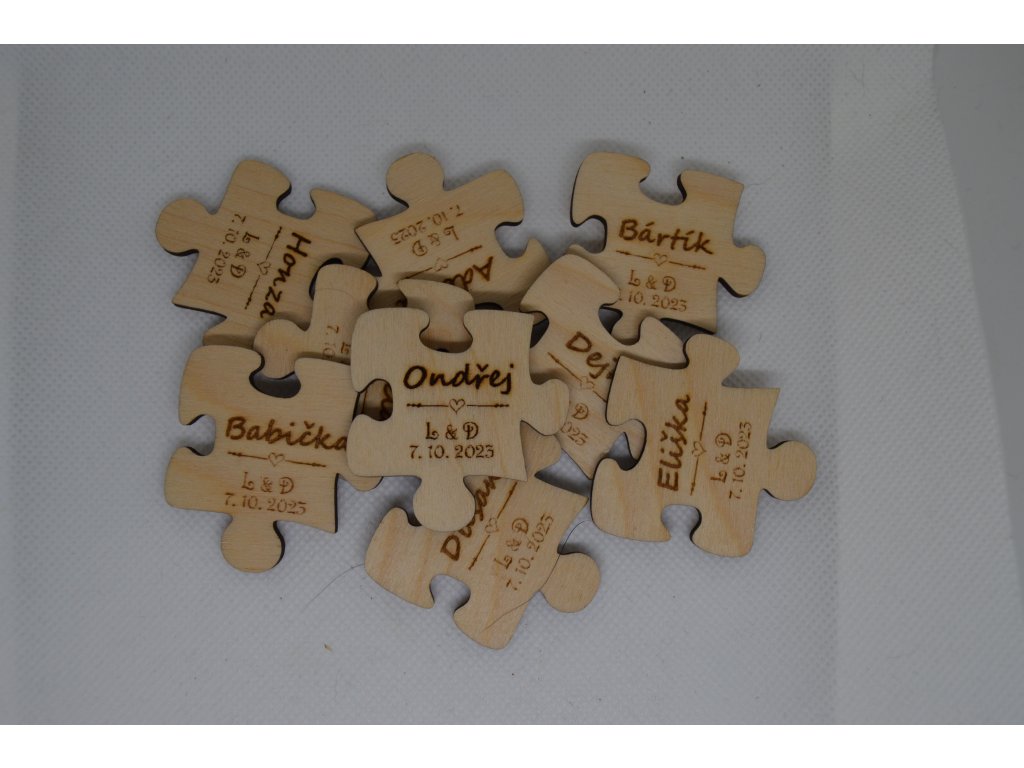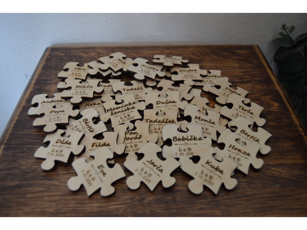 Personalizované dřevěné jmenovky ve tvaru puzzlíků na svatební stůl – Originální detaily pro váš velký den.