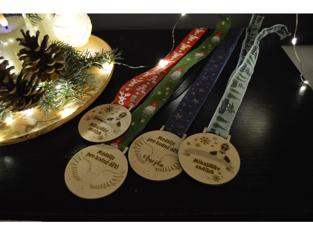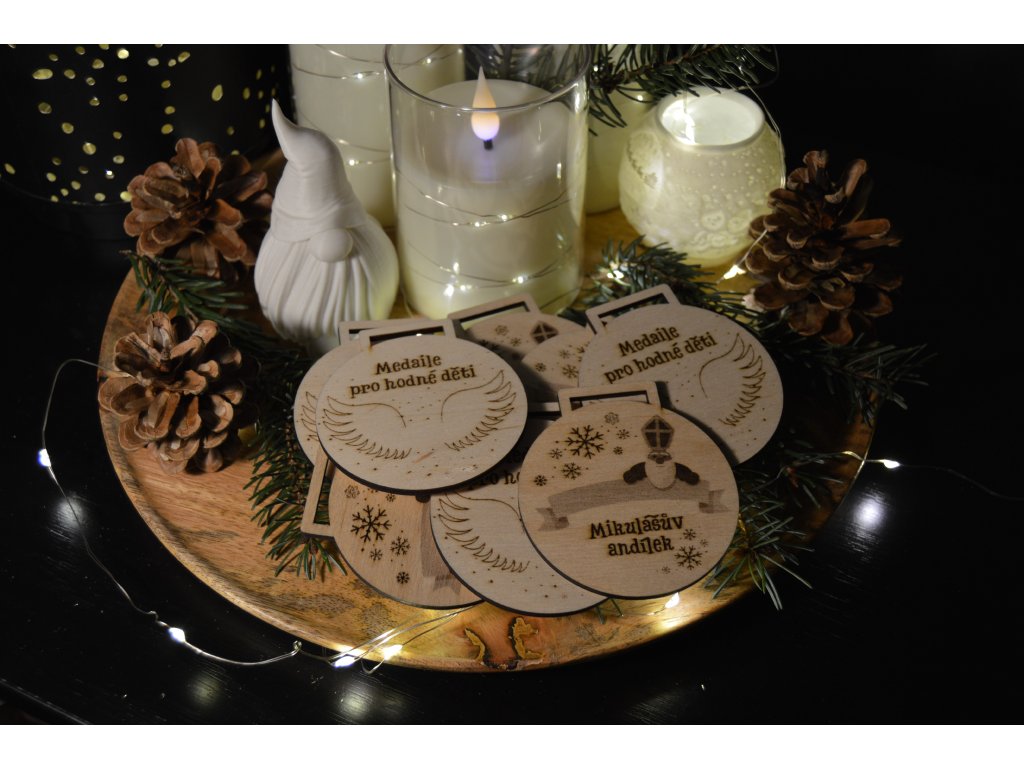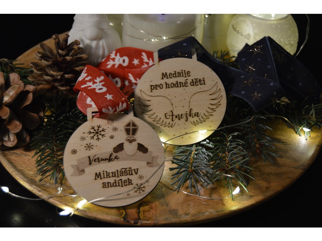 Každá medaile je vyrobena z dřevěné překližky, opatřena krásným designem a doplněna vánoční stuhou pro snadné zavěšení. Kromě sladkostí či uhlí je medaile originálním doplňkem, který dělá celý mikulášský rituál ještě zajímavějším!
