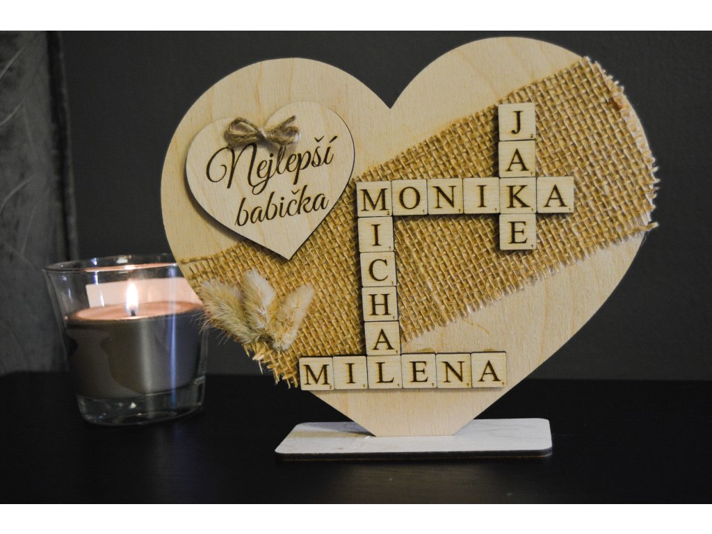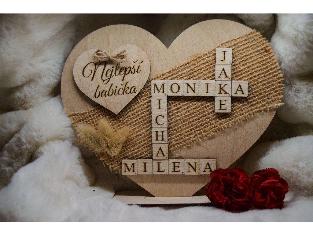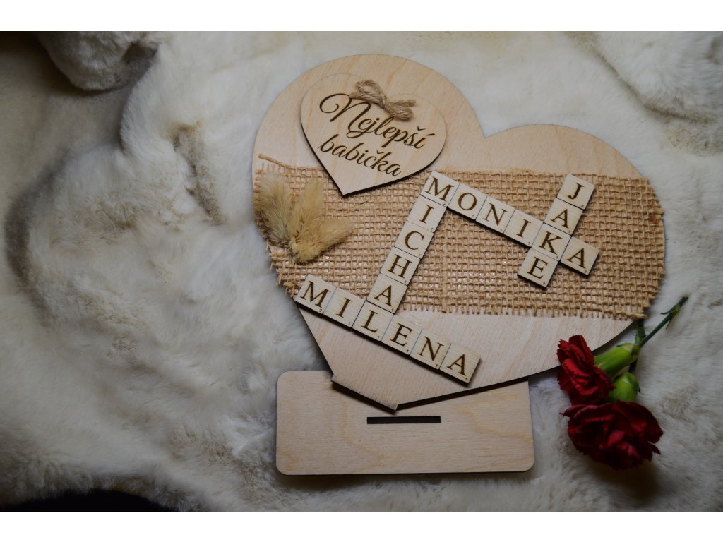 Hledáte dárek, který babičce vykouzlí úsměv na tváři a hřejivý pocit u srdce? 💕 Naše dřevěné srdce z překližky ve stojánku je přesně to pravé!