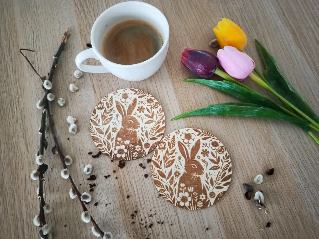 Vyrobený z dřevěné překližky a zdobený precizním gravírováním, je ideální pro každodenní použití i jako milý jarní dárek. Ať už si vychutnáváte ranní kávu, odpolední čaj nebo velikonoční hostinu, tenhle zajíček vám bude dělat společnost.