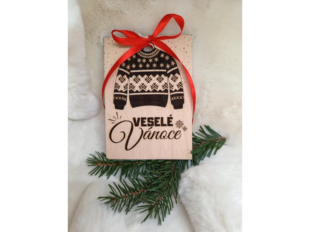 Každé přání je vyrobeno z dřevěné překližky, precizně gravírované, a doplněno stuhou pro snadné zavěšení ozdoby na vánoční stromek.